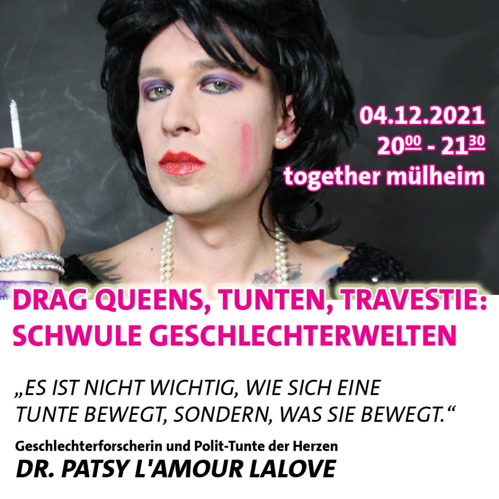 Gesprächsabend mit Geschlechterforscherin & Polit-Tunte PATSY L’AMOUR LALOVE im together mülheim am 04.12. zwei Vorstellungen